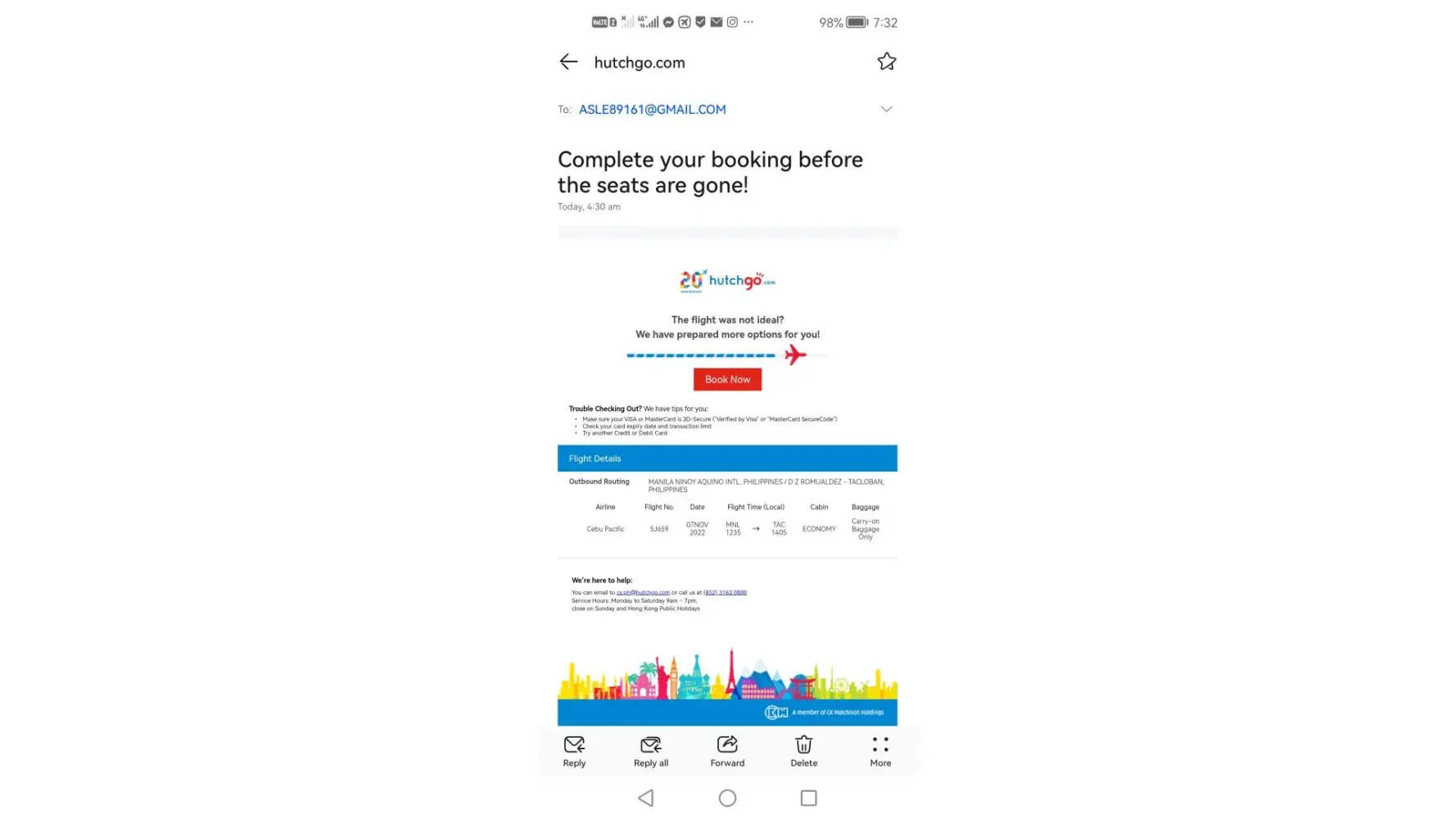 I booked a flight online today (10/04/2022) in hutchgo.com with cebu pacific flight from tacloban to manila [protected] for 2 person but i only got incomplete details even the ticket has no booking reference. It is booking for 2 person but only got 1 ticket. Hoping you can help me on this matter. Please see Attachment