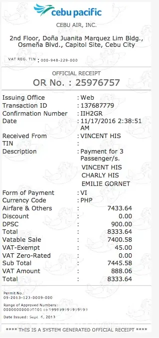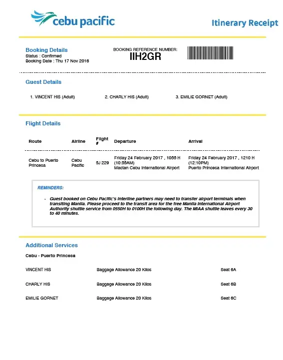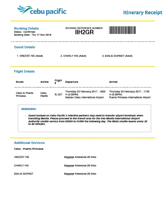 We have booked our flights on November for 3 tickets from Cebu to Puerto Princessa for an amount of 8333, 64 PHP.