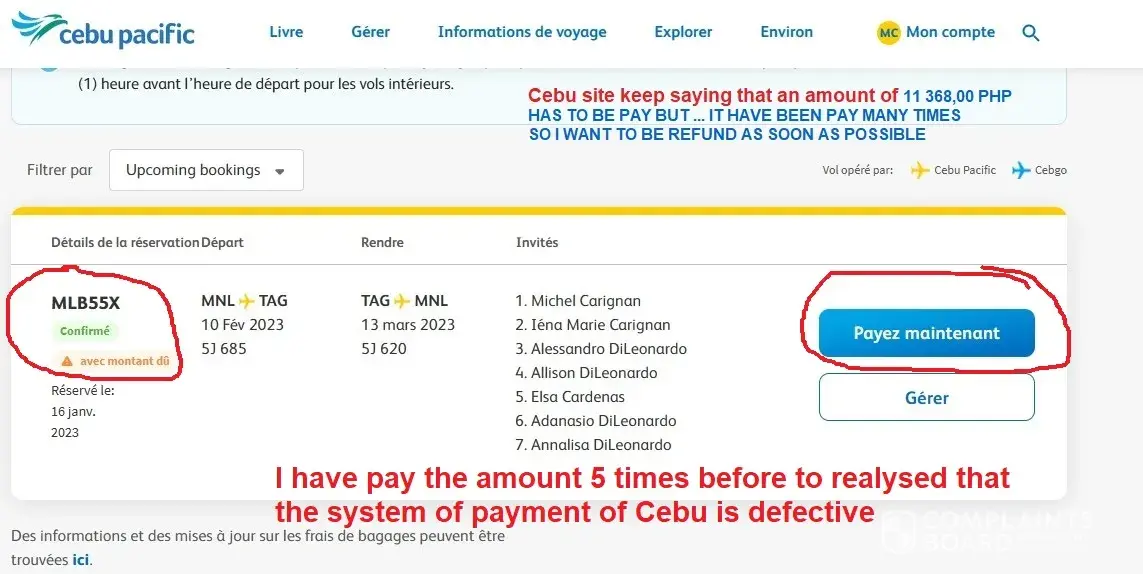 Cebu Pacific's online payment system is defective. Following a change of hour for a Manila-Mnl-Bohol-Tag flight (Cebu MLB55X) there was an additional 11,368.00 PHP that I paid 6 times by what the system sends me an email saying that The pay was not made. Besides, even today the reservation site tells me that there is still an unpaid amount of 11,368.00 PHP .. I demand that CEBU Pacific renounces me as soon as possible the 48 958.40 PHP that I paid too much.