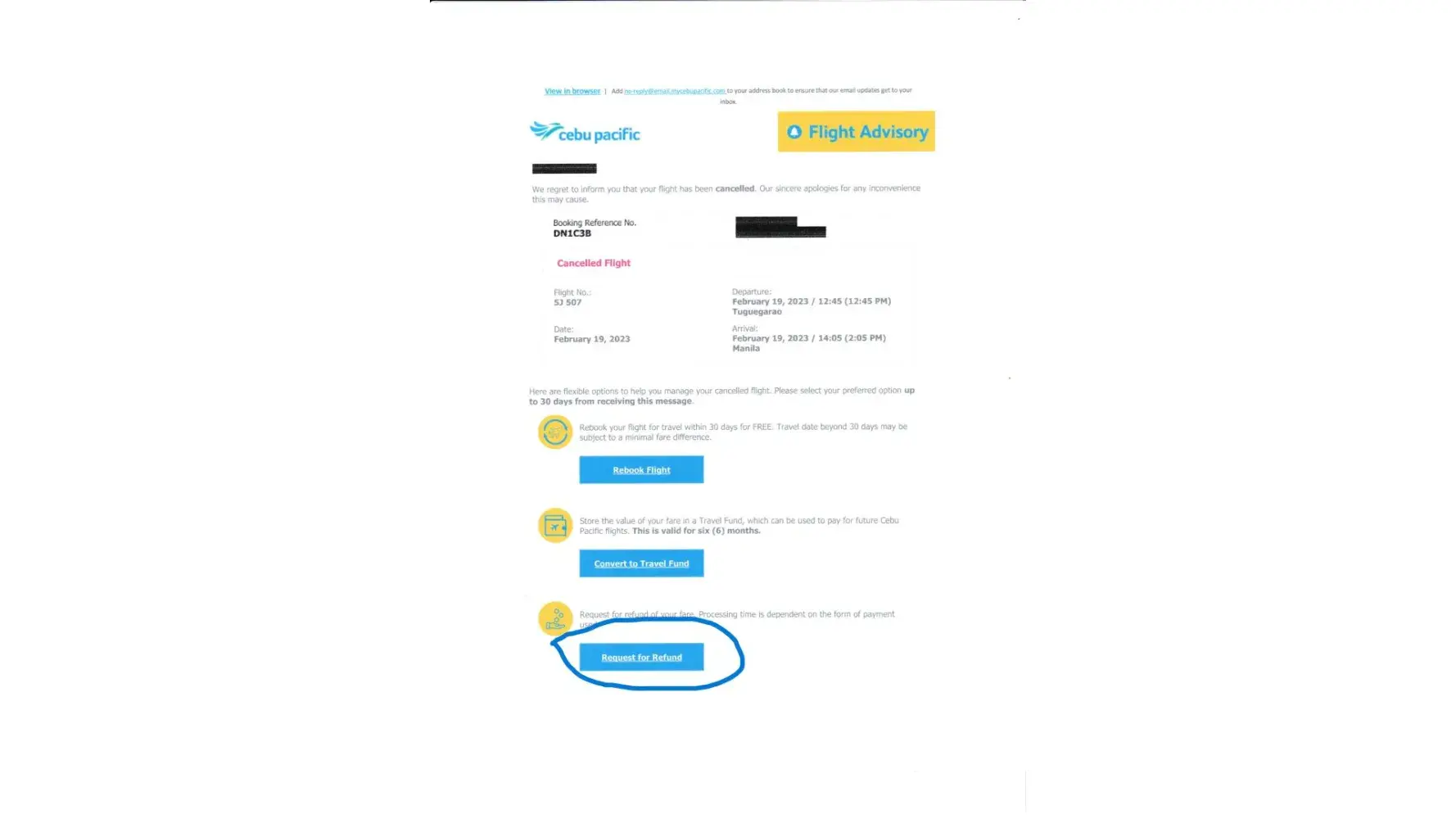 Customer service at NAIA terminal in Manila and Email requesting refund