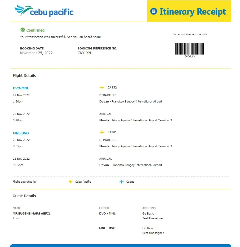 I was not able to save a copy of my boarding pass (flight back from NAIA to Cagayan de Oro). I thought boarding pass will be automatically saved in my CebuPacific Account, hence, did not bother to screenshot or download a copy.