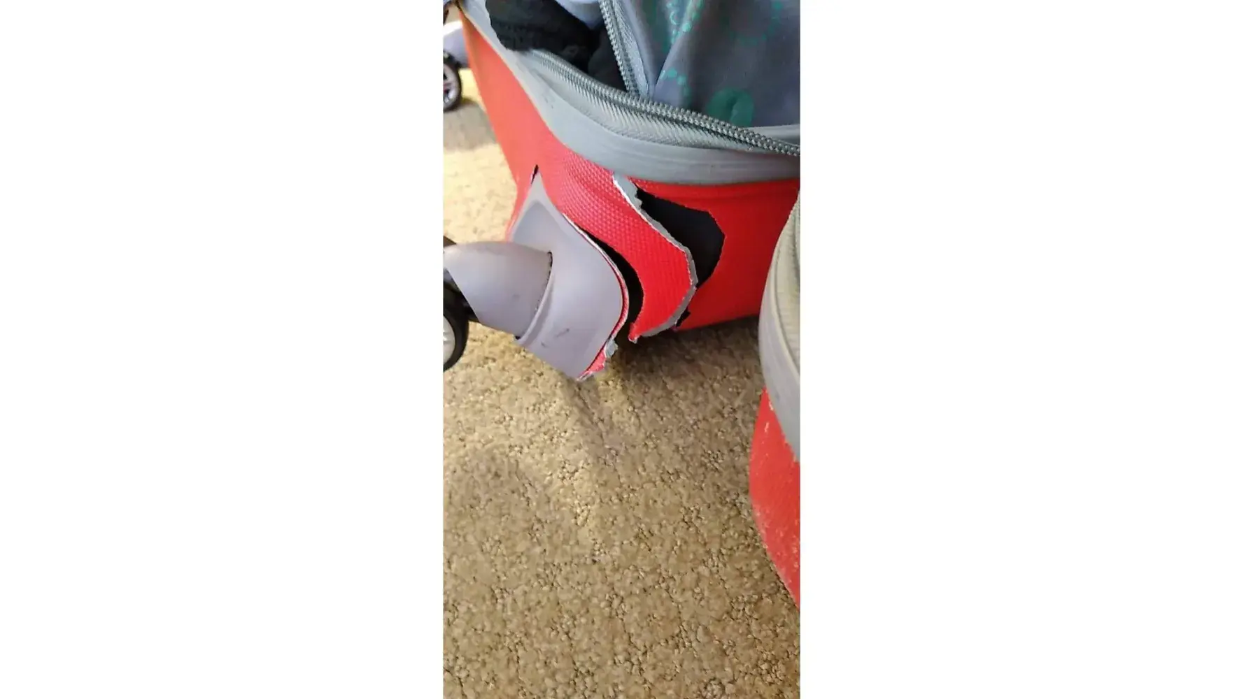 As will be shown in the photo attached, one wheel of my luggage was missing while the other one is about to fall off. When i found it in the carousel, the zip was also slightly open.