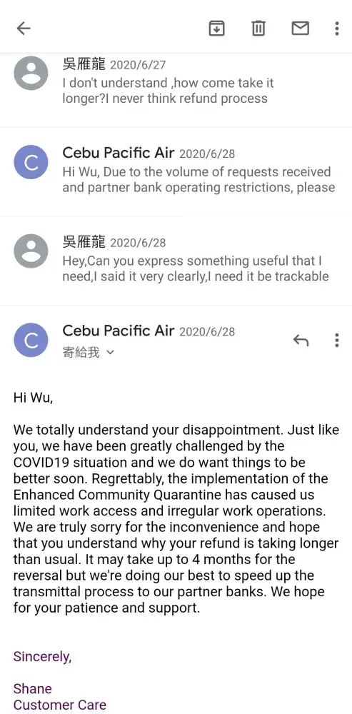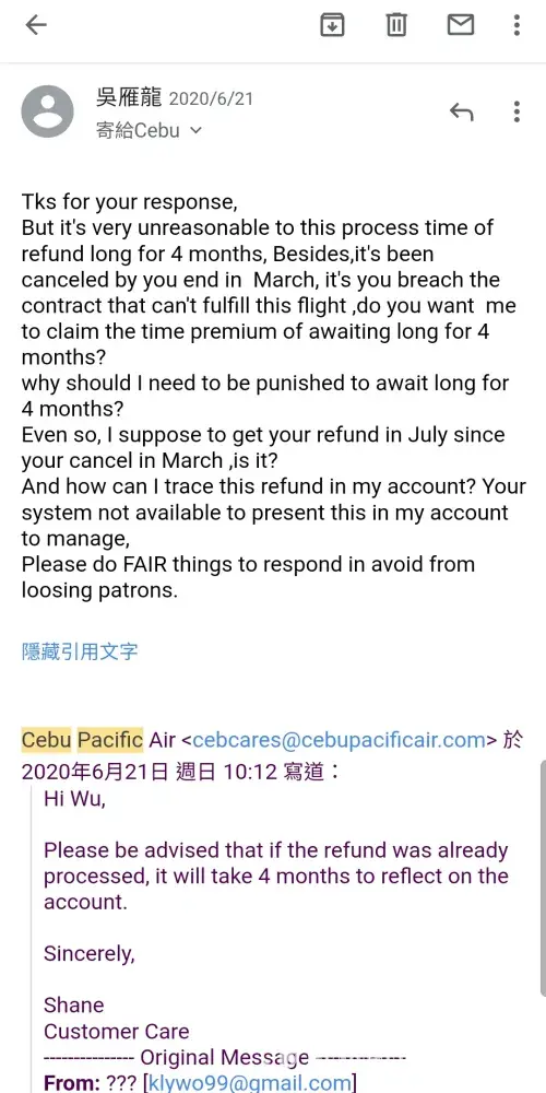 I claimed to refund my flight cancel due to covid19, flight No:SGVPQW, but no response, no refund, and the contact email:[protected]@cebupacificair.com did unacceptable manner with irresponsibilitu really annoyed me, no response, no refund until now.