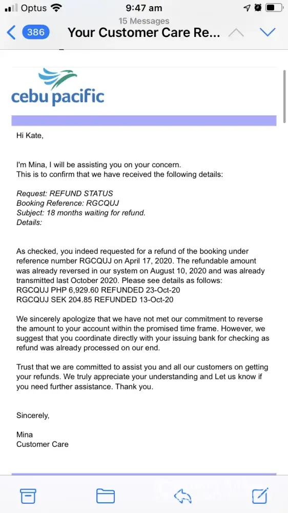 Cebu Pacific customer service is no longer responding to my refund request for booking FEECMZ. I first submitted an application for refund last year (July 2020). I've been very patient whenever they tell me the process has not yet been completed. Around October 2021 I asked for another follow-up & they asked for one of the passenger's birth certificate. I have them a heads up that it might take me a few days to submit a copy of the birth certificate since I have lost it. They were very gracious about it. But once I did submit a copy, they no longer respond to my many emails. My Customer Care Reference Number is 4901106.