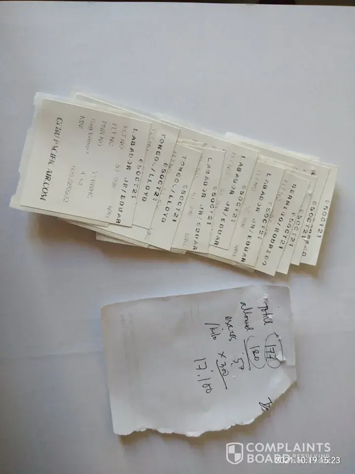 The incident happened last Oct. 5, 2021 under flight no. 5J 996 & booking ref. no. YEBWHC from General Santos to Manila (name of passengers: Rodrigo Bermido, Lloyd Tongol & Eduardo Labador Jr.). Every passengers have 40kgs baggage allowance & they exceeded 57kgs. The cashier just gave them handwritten computation of the excess baggage. But the receipts for the excess baggage amounting to php 17, 100.00 was not given. May we request for the receipt for the said amount for us to reimburse it to our clients.
