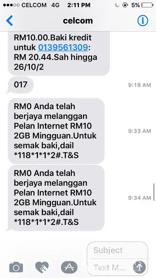 pada jam 9.26 am, saya periksa kredit saya sekali lagi dan ia masih rm20.44. dan pada jam 9.33, saya mendapat mesej dari celcom mengatakan langganan internet mingguan saya telah berjaya. pada jam 9.34, sekali lagi saya menerima mesej yang sama. kemudian, saya periksa kredit saya paada jam 9.34 dan 9.35 am, dan ianya berbaki rm0.44 sedangkan saya tidak membuat sebarang penggunaan kredit. di sini saya kehilangan rm10.