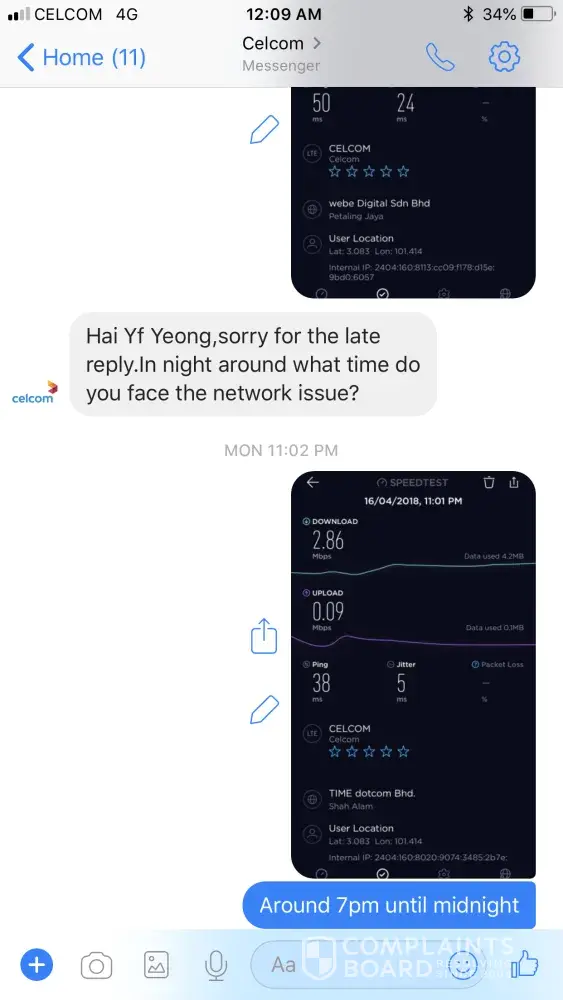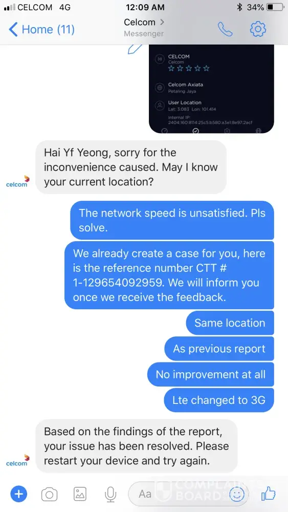 Saya pengguna celcom pospaid telah membuat aduan mengenai masalah rangkaian yang sering hilang yang berlaku selang 3minit di semasa menggunakan data..Apabila aduan dibuat feedback akan dihantar yang mengatakan masalah telah diselesaikan dan selang beberapa minggu masalah yang sama berulang..Apakah perlu aduan dibuat sepanjang minggu?Mohon Tindakan.