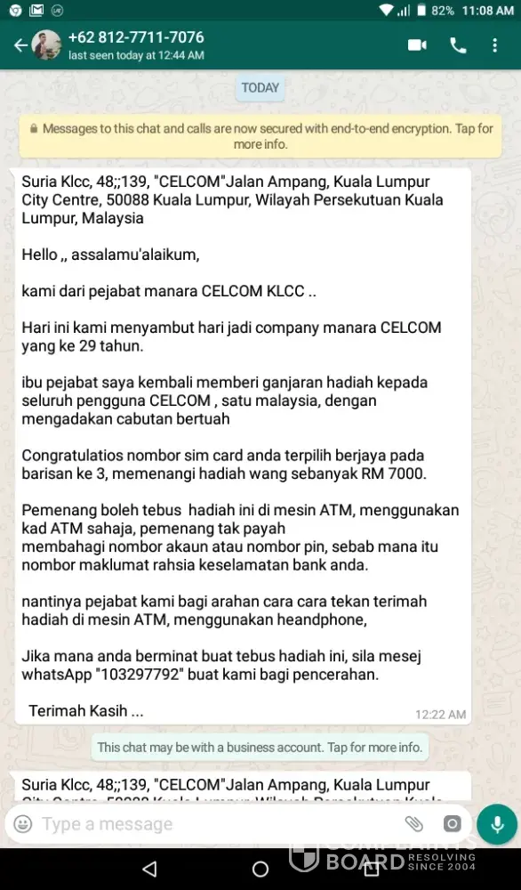 I want to report a fraud using celcom brand.but i have to call celcom and charging me for every minute of my call to report this fraud. So this is the msg that i got.do something.