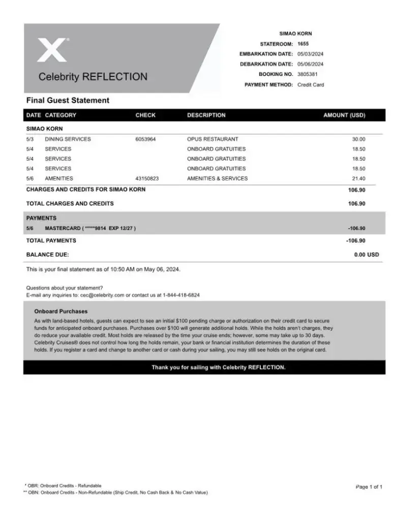 My name: simao korn ship: celebrity reflexion embarkation date: 05/03/2024 debarkation date: 05/06/2024 booking no 3805381 payment method: credit card
