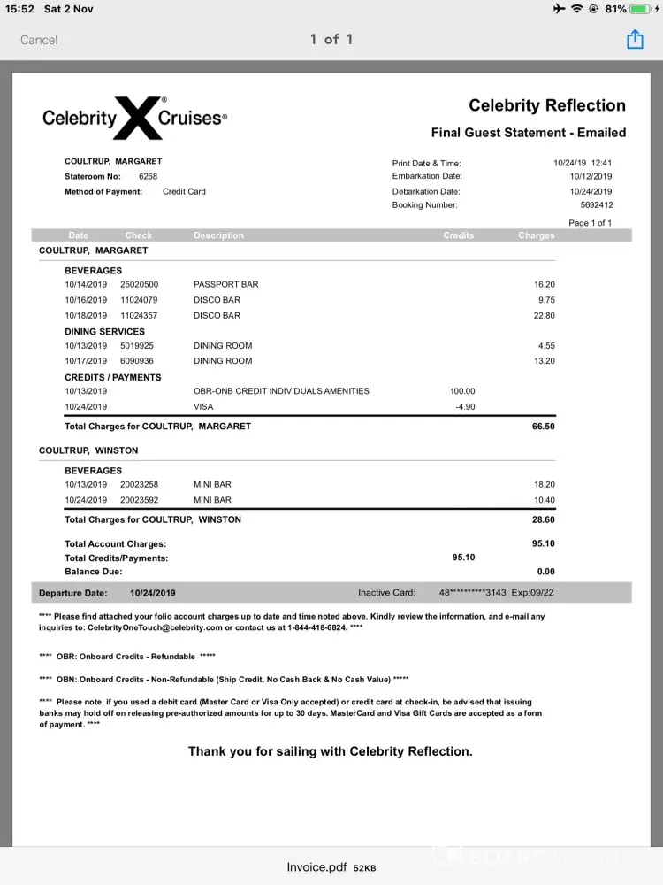 We were on a Celebrity Reflection cruise from 12 to 24 October 2019, it was our first Celebrity Cruise, we consumed one bottle of water and a small pack of Pringles chips. We were charged £28.60p, we think we were grossly overcharged, we would like our money back.