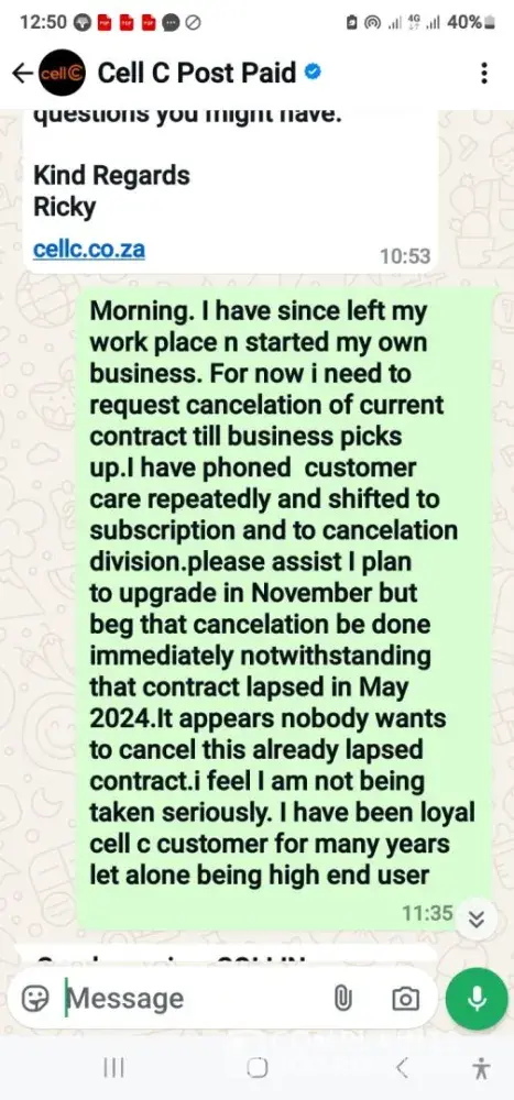 I am writing to express my significant dissatisfaction with the service I have received from Cell C. As a long-standing customer for 16 years and a Vodacom manager, I am disheartened by the numerous issues I have encountered recently. On Tuesday, February 4, 2025, I was contacted by one of your upgrade consultants, who informed me that my lines were due...