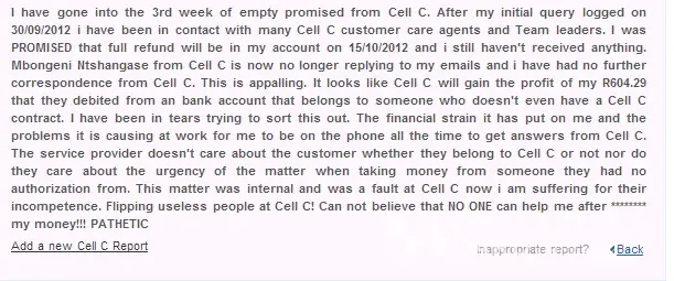 Complaint 2: I have gone into the 3rd week of empty promised from cell c. After my initial query logged on 30/09/2012 I have been in contact with many cell c customer care agents and team leaders. I was promised that full refund will be in my account on 15/10/2012 and I still haven't received anything. Mbongeni ntshangase from cell c is now no longer replying to my emails and I have had no further correspondence from cell c. This is appalling. It looks like cell c will gain the profit of my r604.29 that they debited from an bank account that belongs to someone who doesn't even have a cell c contract. I have been in tears trying to sort this out. The financial strain it has put on me and the problems it is causing at work for me to be on the phone all the time to get answers from cell c. The service provider doesn't care about the customer whether they belong to cell c or not nor do they care about the urgency of the matter when taking money from someone they had no authorization from. This matter was internal and was a fault at cell c now I am suffering for their incompetence. Flipping useless people at cell c! Can not believe that no one can help me after stealing my money