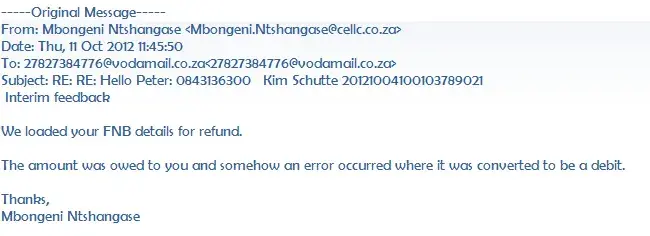 On the 17 of Feb 2012, Katherine the Cell C manager calls me to tell me they have the per mega byte breakdown of my bill in question, and that Cell C have admitted to their mistake in charging me incorrectly for my two days I was on their network. Katherine proceeded to tell me, in the week that followed, that I should put a stop order on my Cell C debit order for this account, so that my incorrect installment does not get debited from my FNB account on the 1st of March 2012, and this will give Cell C til the end of March to correctly credit my bill, when I will go into the store manually and pay, which all depends on how long Cell C take to fix the problems they've created.
