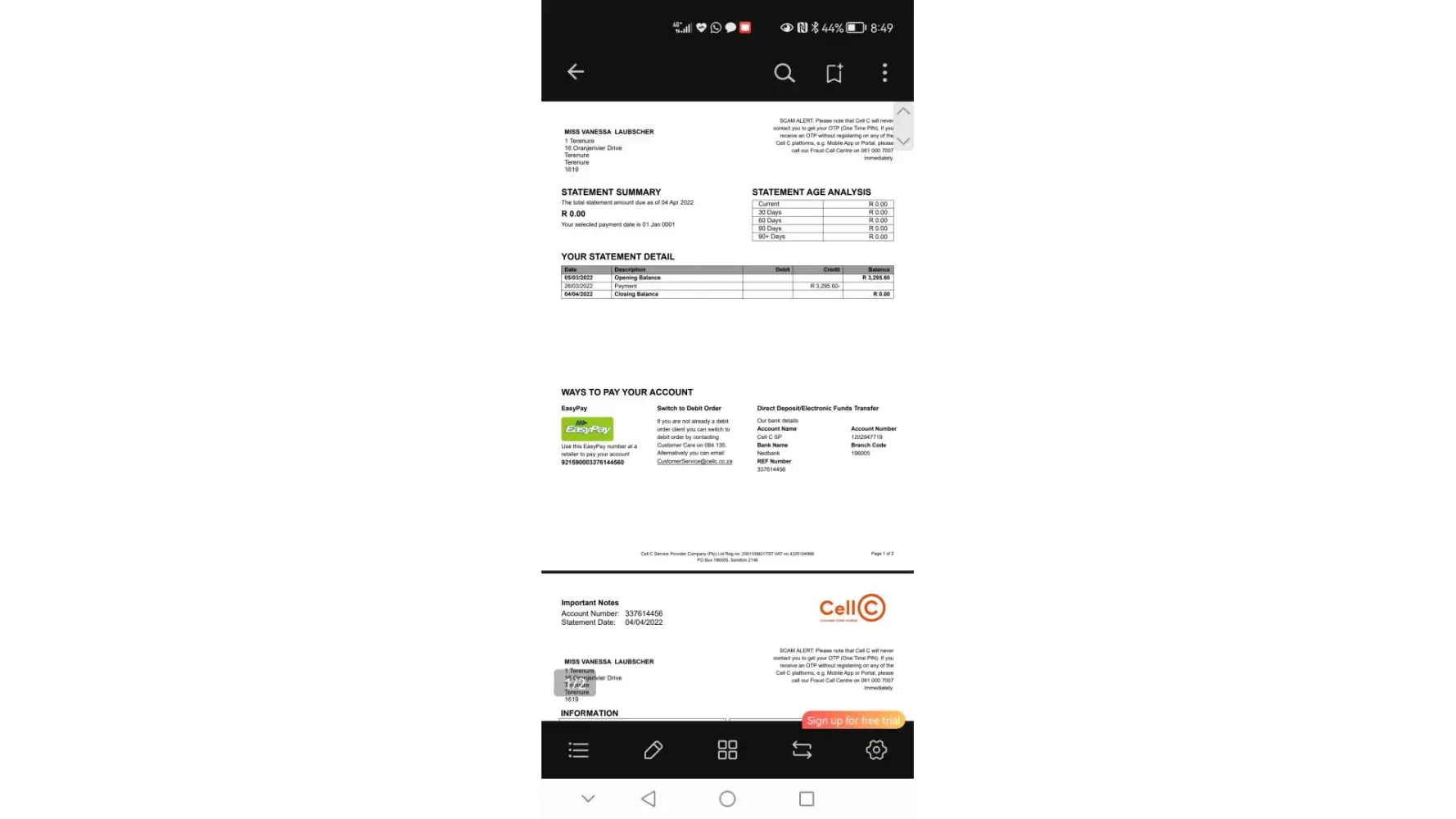 Paid the full balance 25 March 2022, it's been allocated and the statement reflects no balance outstanding, but still cellc does not want to assist. See photo of statement attached in order to update my credit report