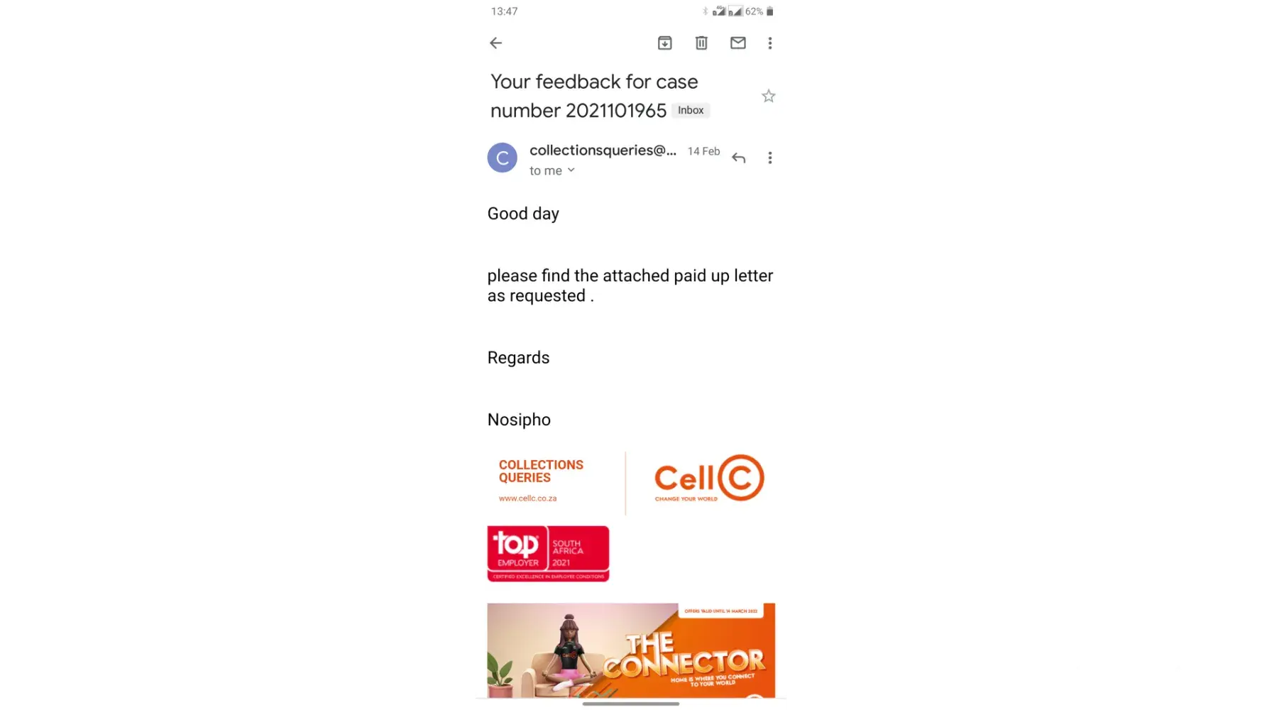Since November 2021 i have been sent from pillar to post & not being furnished with a paid up letter. In January 2022 i received an email saying they have attached a paid up letter but there was no attachment on the email. I have called customer care & cases being logged but i seem not to be receiving meaningful assistance from cell c