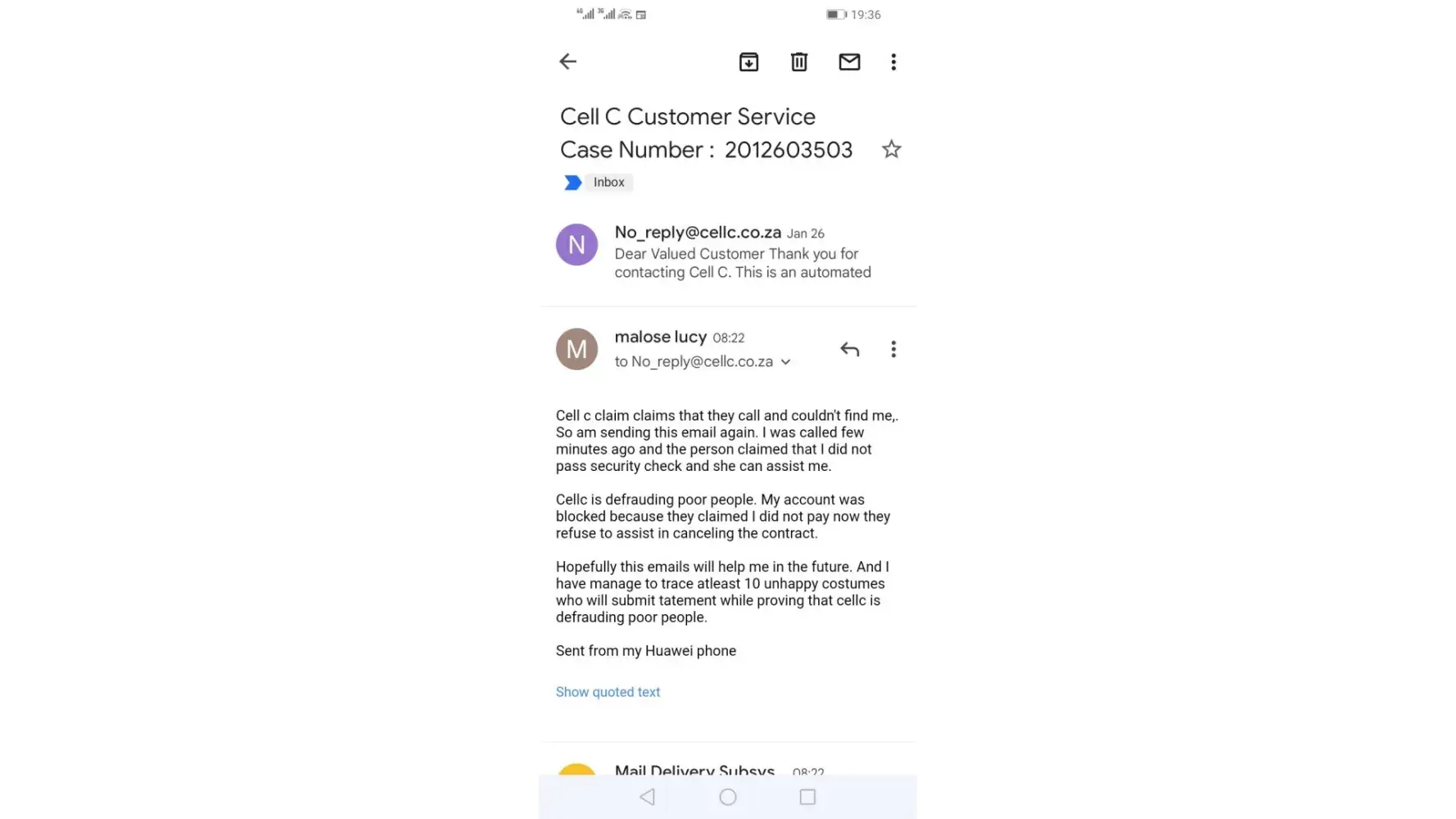 So on my way home I called customer service again and told the lady what happened. She said I have to go to the Cell C store and they need to refund me. So I told her I just came from there and Sihle and Vivian told me it is my problem.
