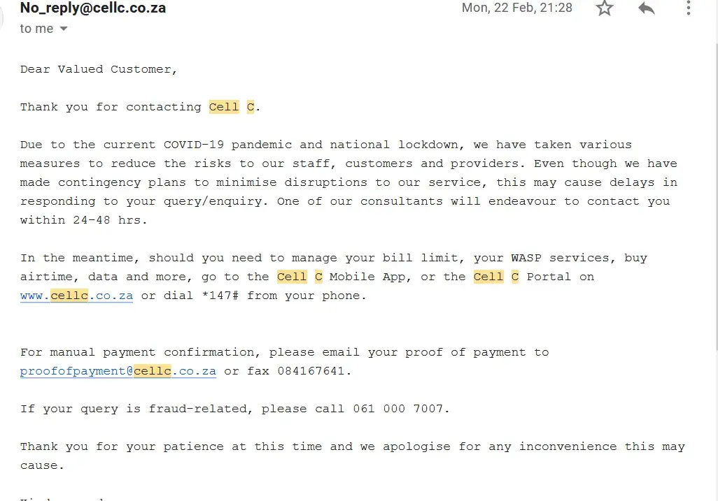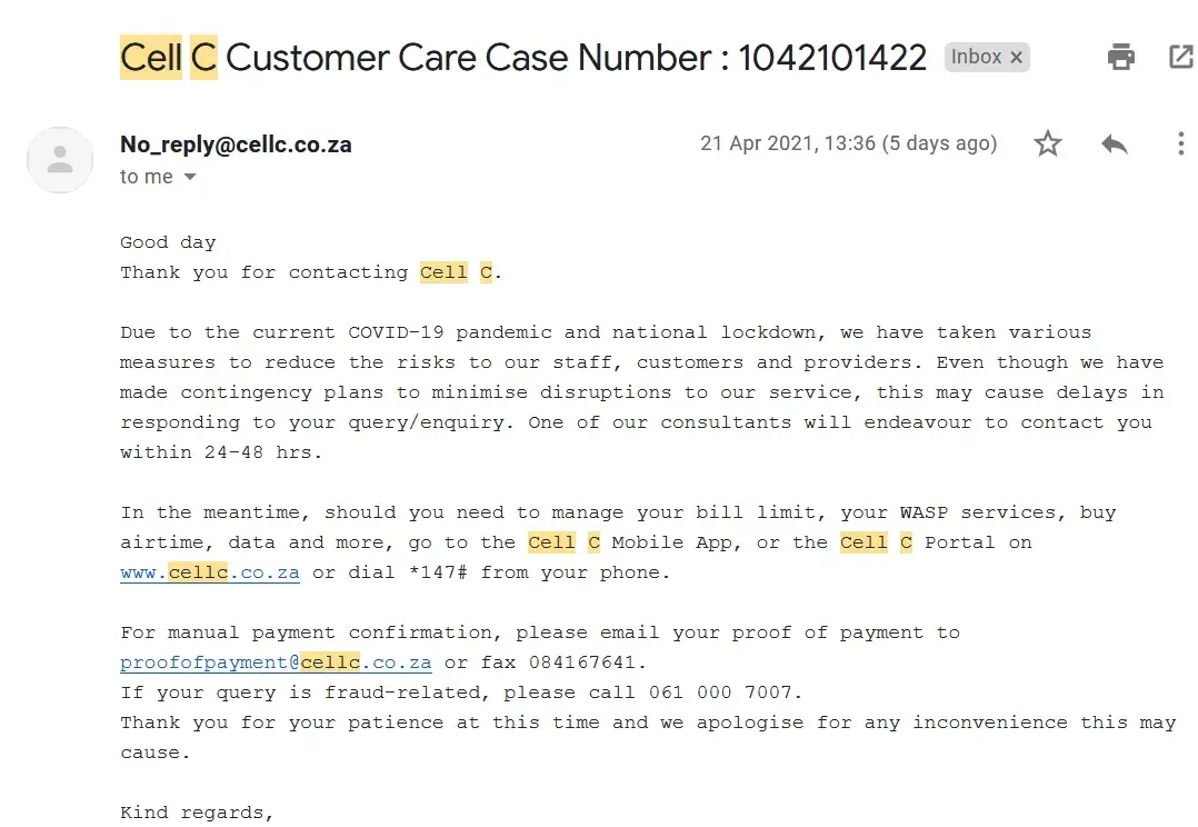 3 March 2021 : Email sent to [protected]@cellc.co.za