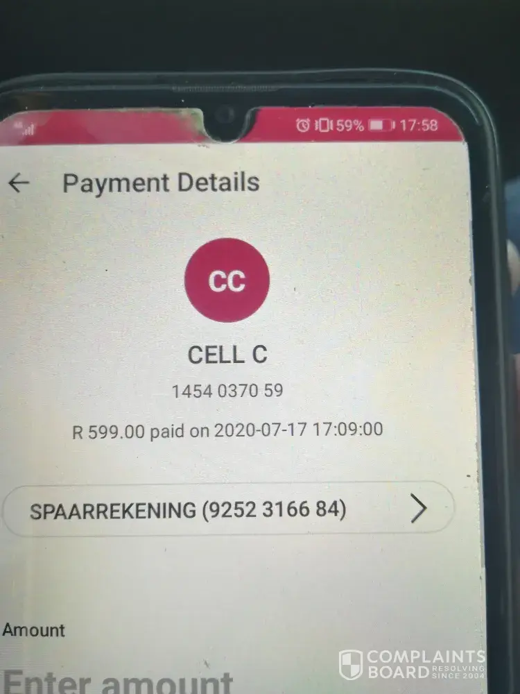 I have done an eft on the 17th showed all my bank statements stating it was done by eft inetbank payment. On the 22nd cell c did debit again after I phoned on the 10th saying money will only be in on the 17th. So I reversed it on the 24th.