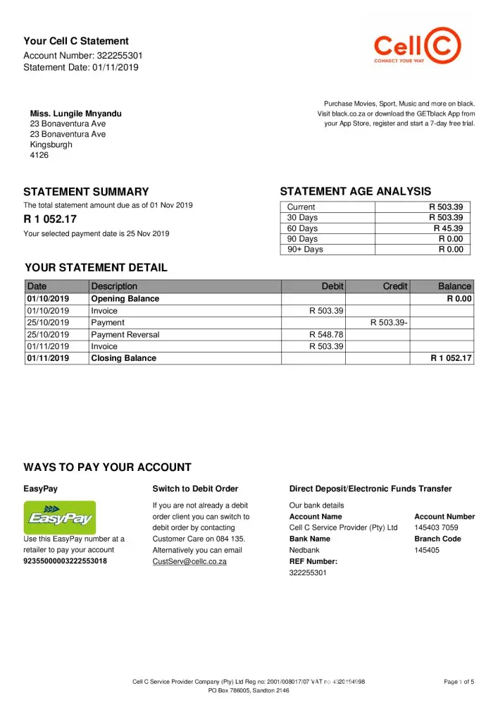 This email serves as a complaint to Cell C collection/billing department, I have an account that I opened on the 04 January 2020 and axactly on the 15 July 2020 there insufficient funds on my bank account in order for the debit order to go through and I did pay my cell c account an amount of R 448.00 via EFT service using my banking app on the 17 July 20 to this CELL C BANKING DETAILS :