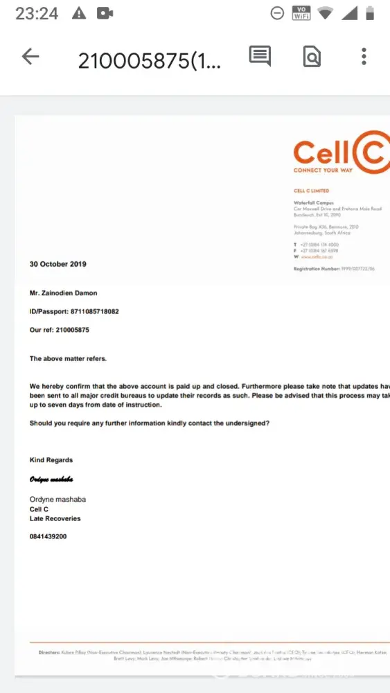 Good day my name is zainodien Damon I'd number [protected] I've opened cell phone contract with cell c August 2017 paid my account every month for 6 months then my account went into arrears in 2018 but then by 30th October 2019 I settled my account in full and closed it and was told by one of cell c agents that my information will be sent to the ITC and my profile will be updated which never happend I've checked my credit report recently and cell account is stil active and reflecting badly on my credit report please help me as I've been struggling with this issue for all over m almost a full year please advice and revert back to me thank you please check attachments for documents related to this issue.