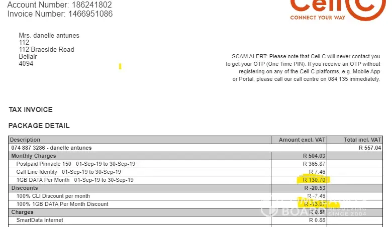 HI, I have tried phoning cell c customer care centre and keep getting cut off as soon as I get through to a consultant. I have wasted R55 in airtime today alone and still no resolution due to being cut off. This is very frustrating. I have logged a complaint with regarding to my statement on the cell c website already with the hope that someone would resolve this error before the debit order goes off, yet to date I have had no response back on the complaint and the statement still reflect incorrectly. Please refer to the attached showing that I should get 100% discount on the 1gig data that is part of my package, yet my statement reflects only a 10% discount. THis is incorrect. Refer to below account number and invoice number.