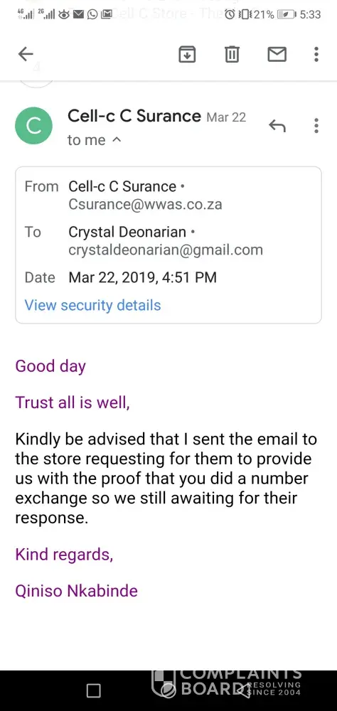 On the 16/03/2019 I took my phone to cell c store for repairs. I filled in the claims form and it was submitted. I called the call centre 2 days later to follow up and they tell me that they have not received any documents. So I resend all documents. When I follow up again, the agent by the name of Quiniso Nkabinde says she's waiting for proof of number exchange. I go to the branch again to get this and send back but you guys say you still awaiting for number exchange document. Another agent calls the branch and still cannot get the document. I've called you several times and visited the branch 4 times already and still my phone hasn't even been processed for claims. I am 8 months pregnant and you guys are making me run up and down! I am so pissed of with your service!The branch blames the call centre. The call centre blames the branch. What the hell is going on with cell c? Nobody wants to take accountability. Nobody wants to assist me! Very nicely I was sold a phone with insurance. Very nicely my debit orders were collected but when I have a serious problem here nobody can help? First and last contract with this [censored]ty company! I have 3 other contracts with Telkom since 2015 and not once did I have this problem with them. It's no wonder why your company is under so much debt! All your customers are leaving without paying their contracts in full due to pathetic service. Rather you shut this place down!