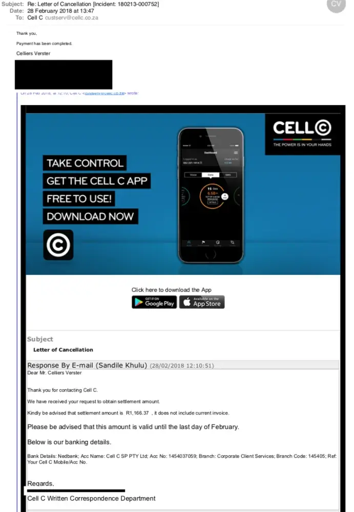 I have a full PDF transcript of all conversations from February with CellC as well as a full PDF transcript of my conversation with the social media consultant.