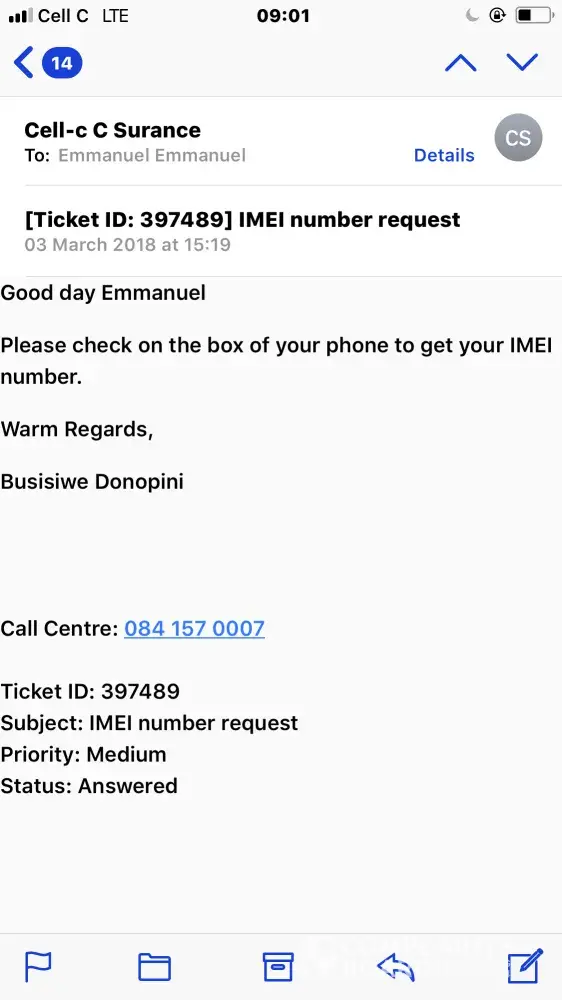 Remember that email I sent on the 29th of Jan to get my IMEI number?... Well guess what, C-Surance finally responded on the 3rd of March 2018. 30 days outside of the window claim period.