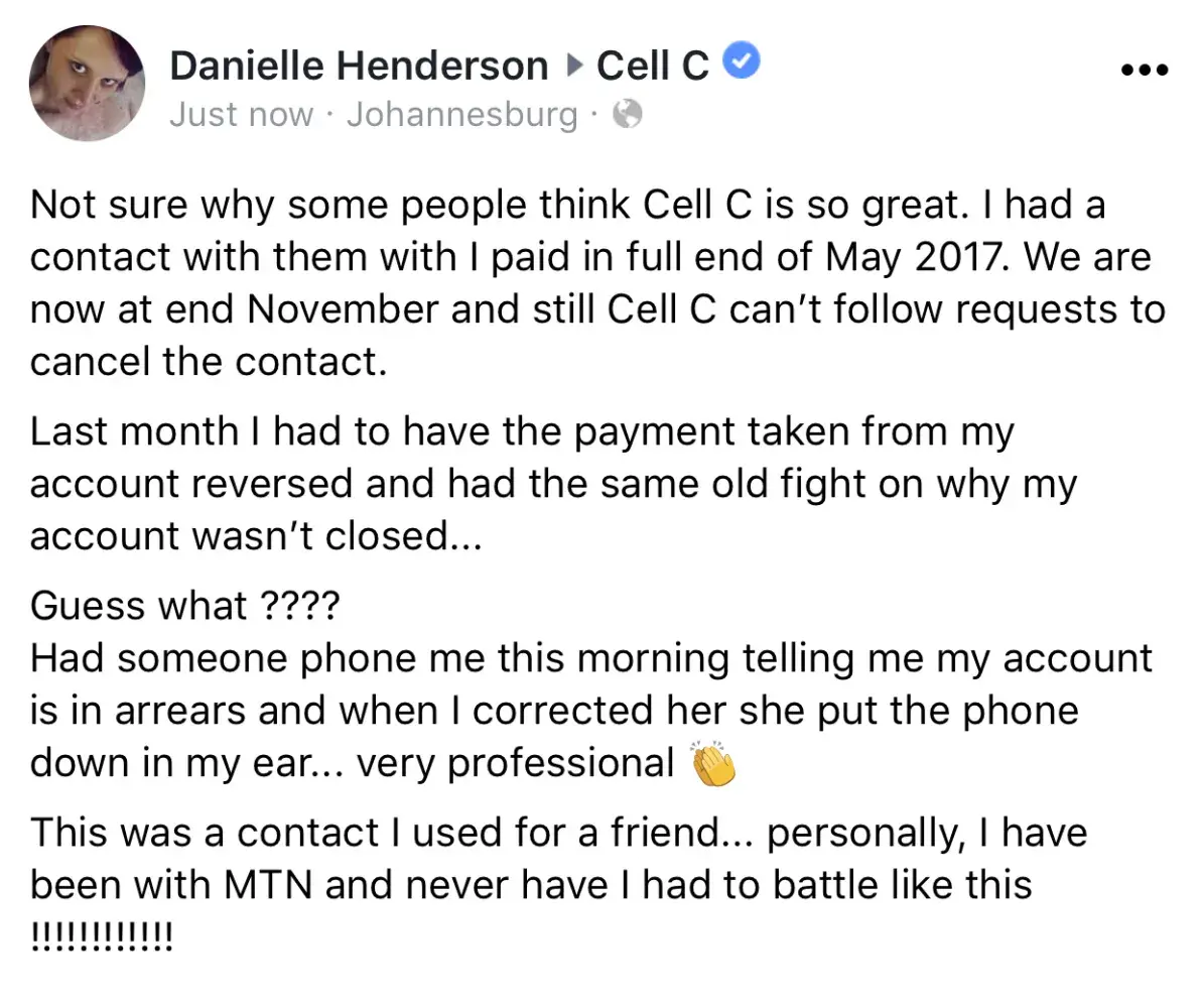 I have called CellC customer care more than 3 times to sort a recurring billing issue. The lack of professional conduct from the personel is beyond me, plus the amount of times one has called is unacceptable. The inconvenience that this has caused is really unacceptable. Cell C has really cost me (having to call from abroad) to sort my family lines and the lack of feedback is beyond me. Please train your teams to excercise empathy when dealing with your customers.