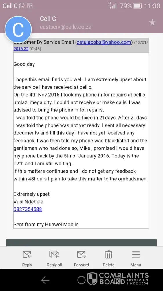 Good day I sent phone for repairs at cell c in November because I could not receive or make calls. I was told my phone was blocked by some called Mike and he says he did it by mistake. Every time I go to cell c umlazi mega city they tell me my phpne is not yet fixed. When I email customer care they tell me my phone is in the shop. I have wasted petrol so many times going to umlazi branch but with no success. I actually dont want this phone back and they should give me a new one. Iv been calling and im veing thrown from pillar to post with no avail.