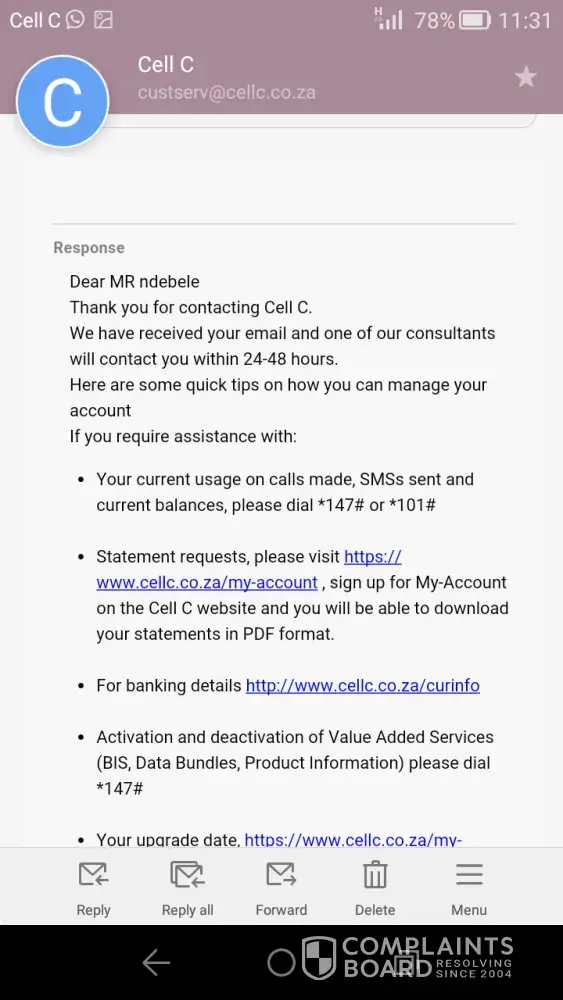 I am beyond the point of frustration with the gross disrespect I as a customer am receiving. Attached are emails I have sent to Skhumbuzo Ndhlovu as well as the messages I have been sending to the Cell C Facebook page.