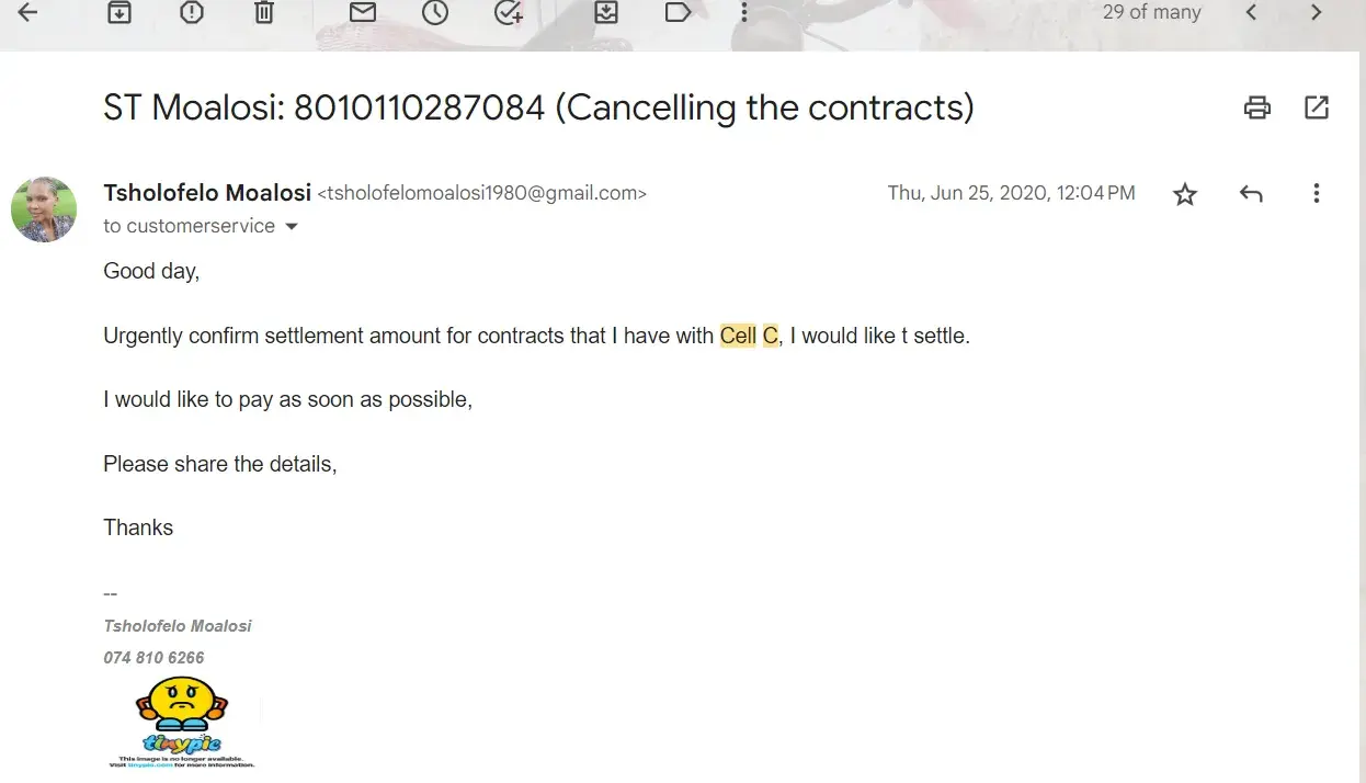 I've been trying to give notice to cancel my cell c contract for approx 3 months. I have emailed, sent requests via the app, called 3 times and visited their store in Fourways mall.
