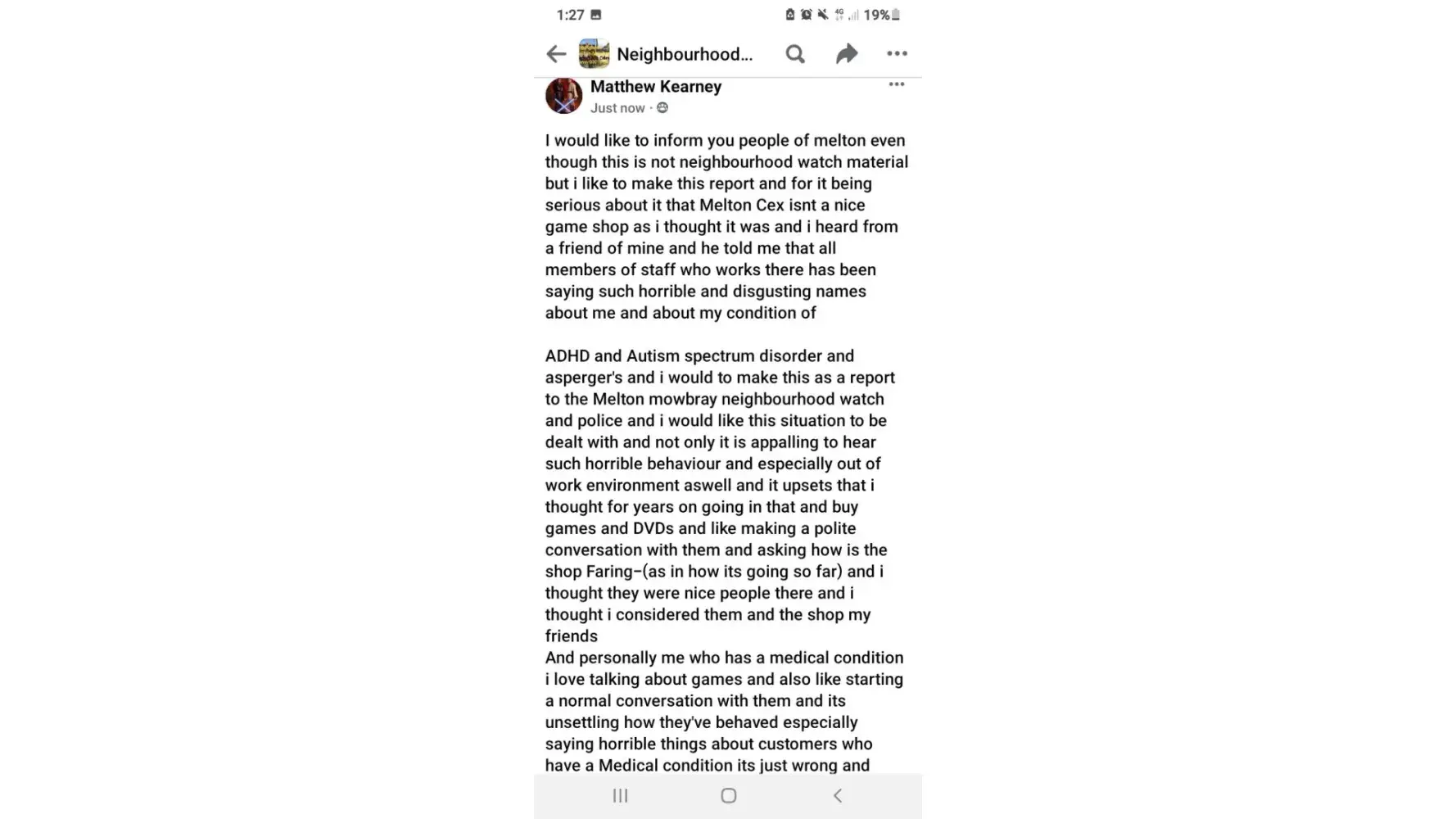 I would to make statement about your members of staff has been saying horrible names behind my back throwing insults about me behind and calling me end i quote "asperger's Andy " which is insult of my condition of ADHD and Autism spectrum disorder and asperger's and it was in Melton mowbray Cex game shop and i would like this matter to be dealt with