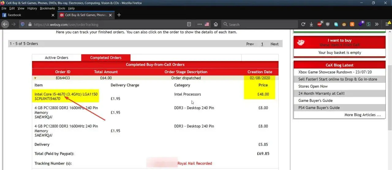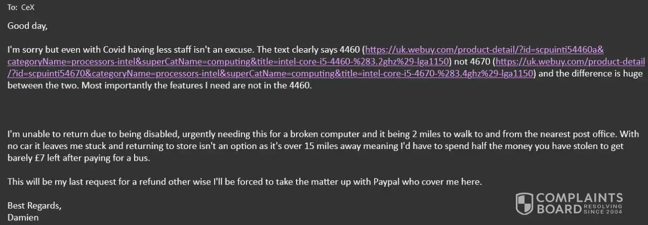 I disputed with paypal and CeX took almost a month to reply, after two messages repeating my past issues paypal have sided with CeX and are forcing me to return not only the CPU I bought but the ram that I bought which was fine.