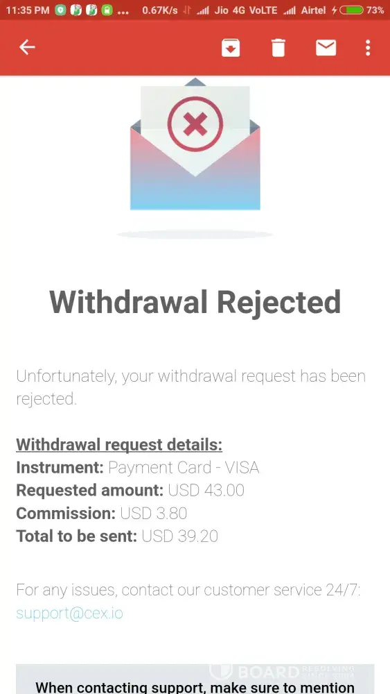 sent to account: [protected] CEX.IO LTD- Reference: cc4022454507
