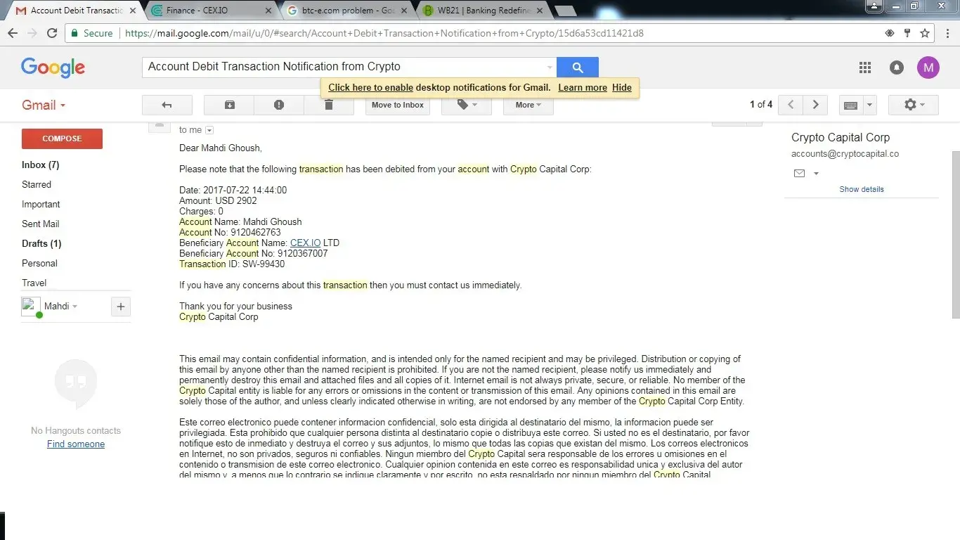 i made deposit via creptocapital for Amount $ 2902 and it is processed by Crypto Capital on 22-07-2017