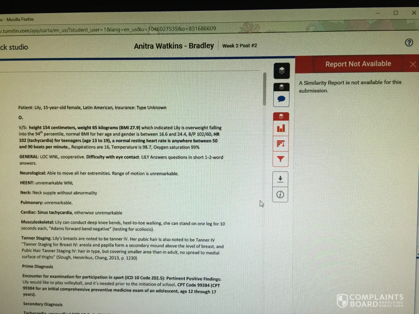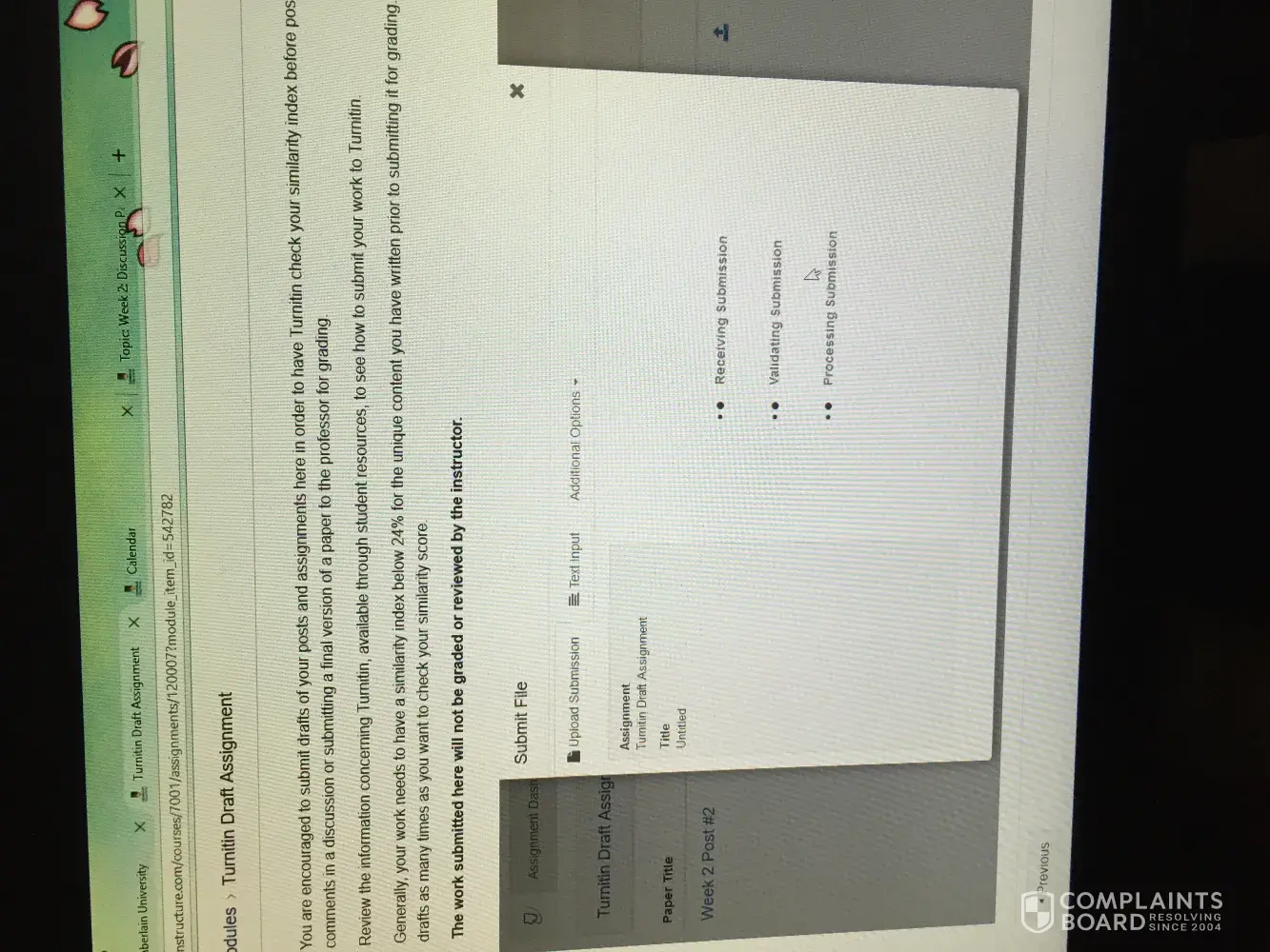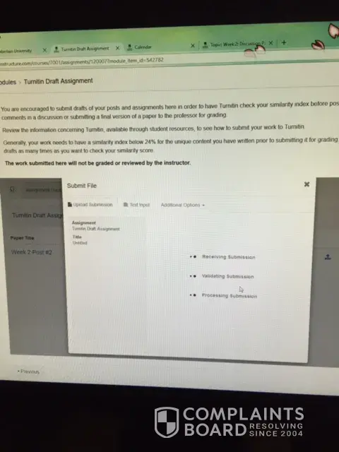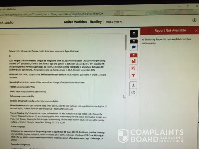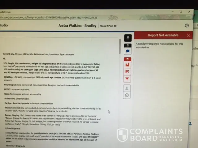 I have been a student at Chamberlain for over 22 months in their Family Nurse Practitioner Program. I am set to graduate in 12/2017. Up until 7/3/2017 Chamberlain College of Nursing has decided to utilize a new program called "canvas", within "canvas", there is suppose to be a program which is to assist us the students to run our assignments through to check for plagiarism before submitting them for grading. I have never had an issue with any assignment until the university decided to implement this new program. And it's been a nightmare. The program is suppose to give a similarity percentage, so that we will know if the 24% cut off is within normal range before submitting our assignments. One of the multiple problems is that the "turn it program" doesn't supply us with a percentage in a time manner, or at all. So, then we are forced to submit the assignments blindly, and pray that the the percentage is under 24% or less. But, the instructors are able to run similarity reports on their end. And then we are penalized with our grades, we are met with threats of dismissal from the program for "plagiarism", when the program that is suppose to be established to work in our favor and best interest doesn't work properly or in a time manner in order to meet deadlines. We are talking, big money spending on this high tuition, extreme time being put into these assignments, and we the students get treated like liars, and that we are dishonest. They are only concerned it seems, is about profitability. And this NEW program which is usually down for all kinds of reason was put into place to make us fail. I have numerous emails, and video's and pictures which show the faultiness of this "turn it in" program. Other numerous students are having the same issues, and individuals express how much they "hate" it, and they feel like they are being set up to fail as well. I have presented complaints, and no one is taking me seriously. So, for my reputation, and academic and career future need someone to do something about Chamberlains actions towards us student. It's out of control, and I've worked extremely hard for my academic success and sacrifice in order to see it go down the drain because of some "geeked" up newly implemented software. It's so"geeked" up Jesus himself would have issues or Bill Gates trying to navigate through it. I'm being threatened by my current professor for issues that shouldn't be if "turn it in" was properly doing its purpose.