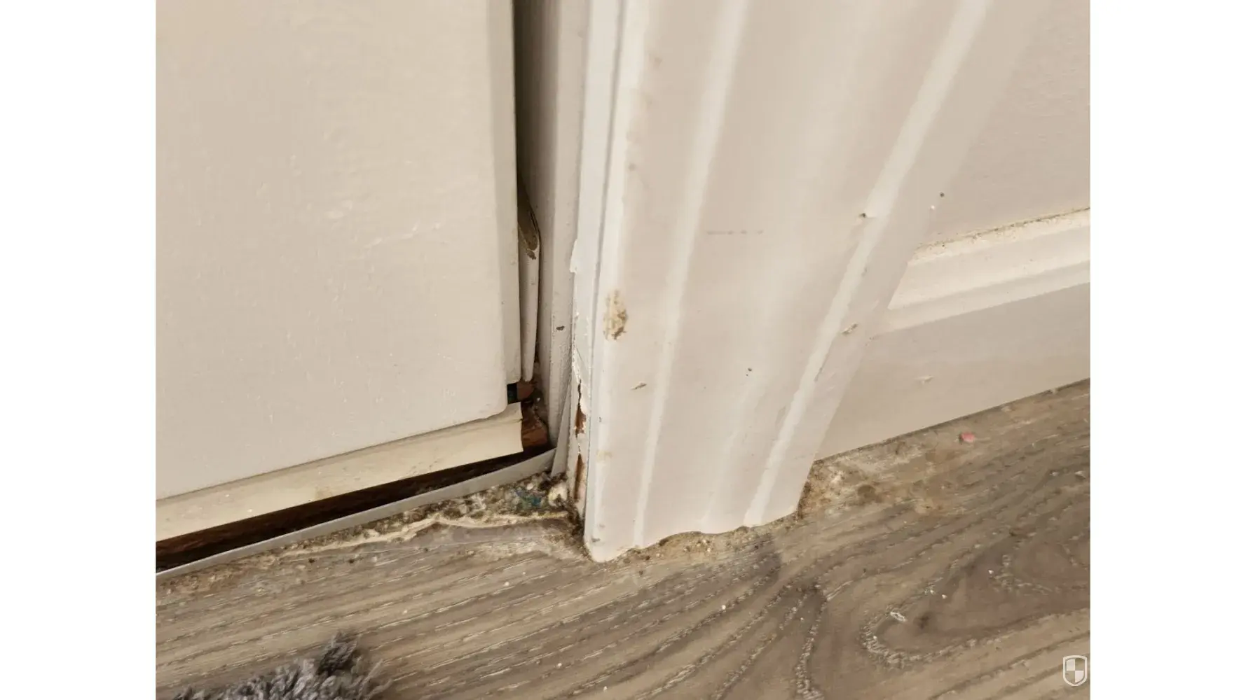 Improper exterior door mounting. Cheap underfloor is pressed product.