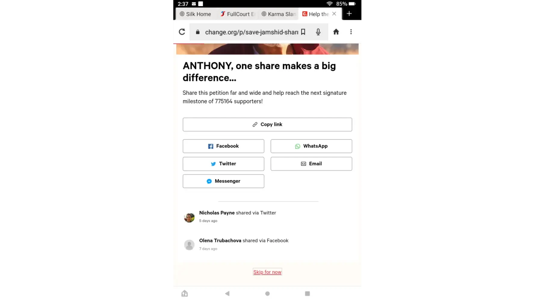 A new window opens asking you to Share the petition. At the bottom is " Skip For Now"