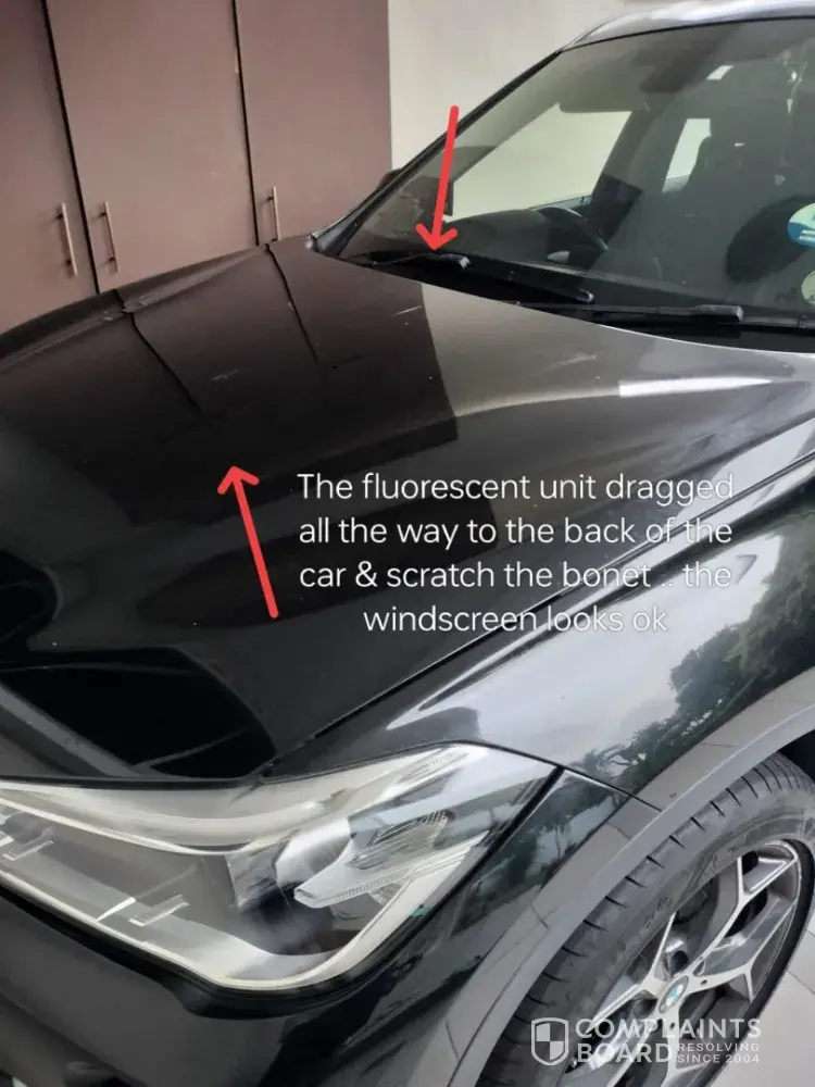 I was on my way for an early check in at Jewel. At B5 heading to Lobby E I ran into a hanging flourescent ligh uint. It knocked my bonet and dragged itself from bonet to the wind screen to the back of my car. There are deep scratches on my bonet. I approached 3 Changi Airport staff who was investicating the incident and they ask me to write in,