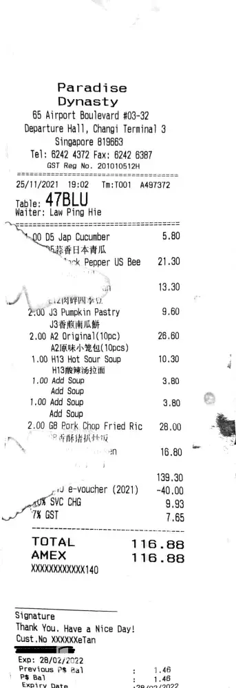 A group of friends and I visited Changi Airport Terminal 3 at Paradise Dynasty on 25th November 2021 between 6:30 pm - 7:45 pm.