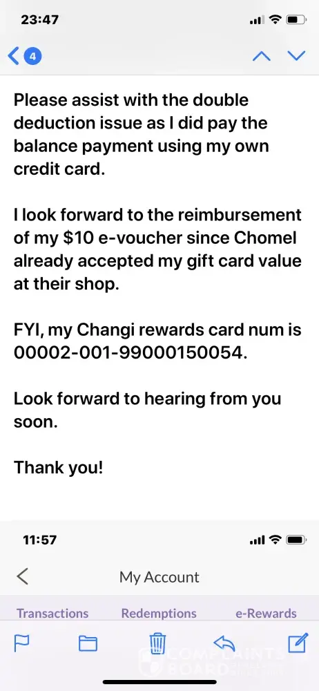 After 20 days of waiting, I received a reply that I indeed used my e-rewards to offset my purchase when I already feedback I used card voucher to offset and was horrified to find out my e-rewards was deducted too without my acknowledgement.