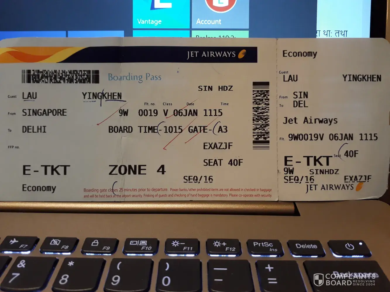 Jan 6, Singapore to New Delhi, jet airways, 1115 hr check in at T3. Ms. Lau Ying Kheng.