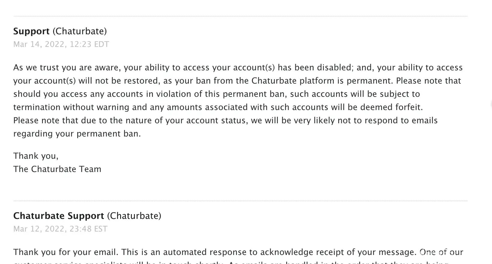 been on cb for years, usually support helps out for most things only a few times i have i just given up but this one has me furious. logged in 3-12-22 to my otheraccount2021 find out my account has been banned with the message 'We have reason to believe that you may have violated our terms of service.' contacted support saying that i haven't been online to be banned and please advise to which i got the response that it is a permanent ban and may not get an answer back due to permanent ban. 'termination without warning'? this isn't right and i don't even broadcast. or how about that i wasn't even logged in for weeks? how am i not able to get an explanation to this? how about the fact that they might be actually wrong? never mind the tokens i still had in my account, this just isn't right.