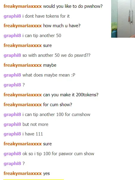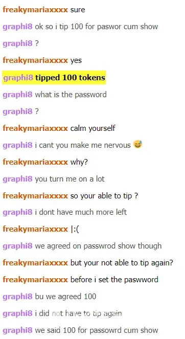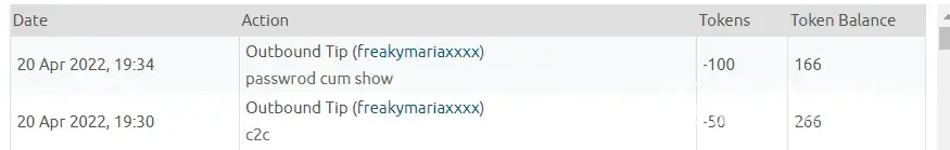 On 20/04/22 I agreed to pay a certain amount, specifically 150 tokens, for services by a model "freakymariaxxxx" and then she refused to give those services and requested more. I have provided screenshots of our dialogue below.