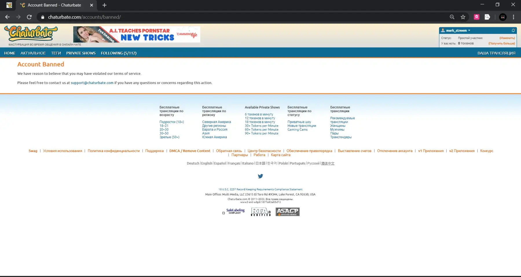 Good afternoon, I was blocked by the site forever, I do not support the policy of prohibition of communication between minors and I know the rules, I complied with all the rules, there were no such messages on my part! Perhaps there were reports of the user who wrote to me about this! I ask you to check all my dialogs because I am sure that I have not allowed a violation, and return my page to Chaturbate! In the letter that sent me the site is indicated "we were informed", this does not mean that I did it! I ask you to double -check all the information! I love my work and I want to return it! My nickname mark_streem