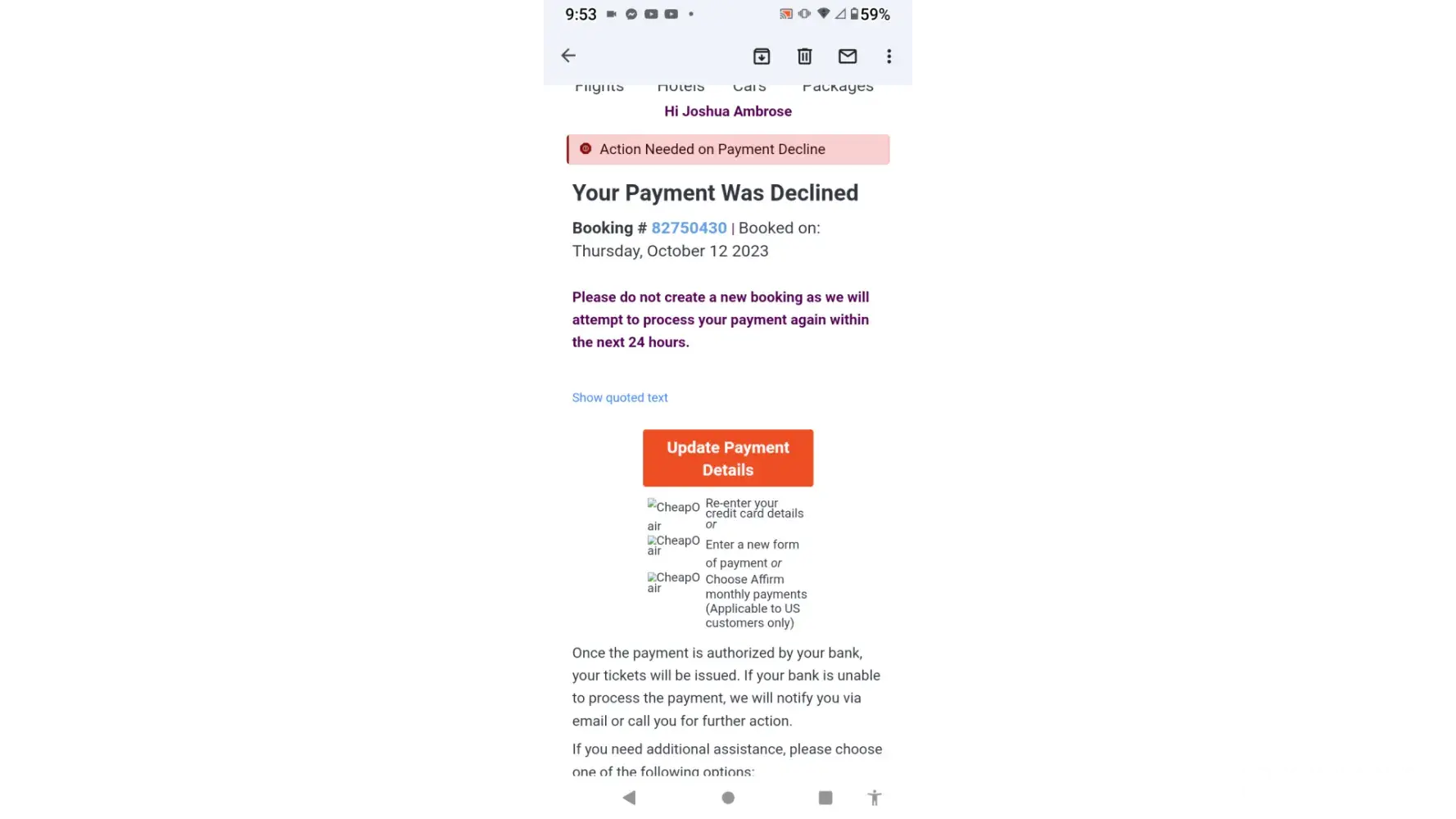 Cheapoair keeps sending me emails stating that they tried to phone me but I have not received any phone calls. I even went to my mobile service provider to ensure I can receive international calls. We are in South Africa.