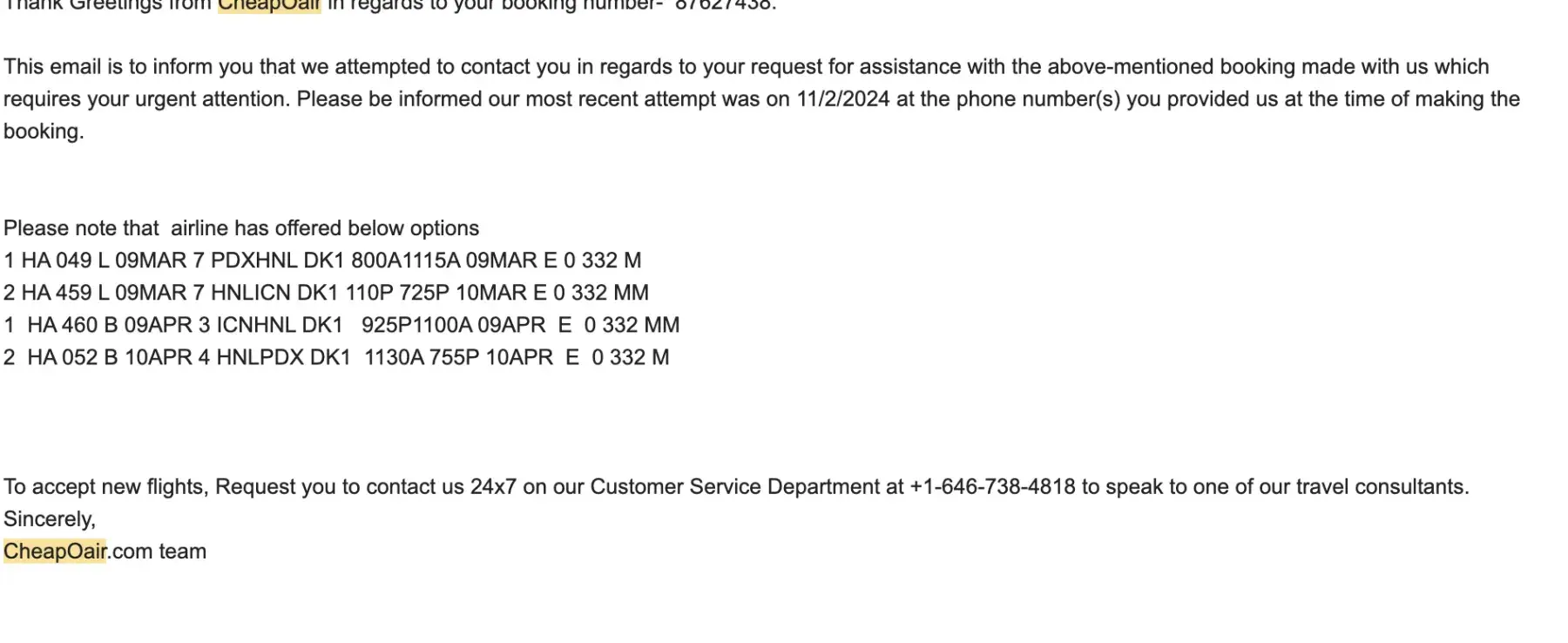 I booked round-trip tickets to Korea for next year through Cheapoair, but the experience has been a nightmare. They changed my return flight, forcing a layover in Hawaii that wasn’t part of my original itinerary. While they promised a full refund if I didn’t accept the changes, they’ve failed to return my money despite numerous follow-ups.