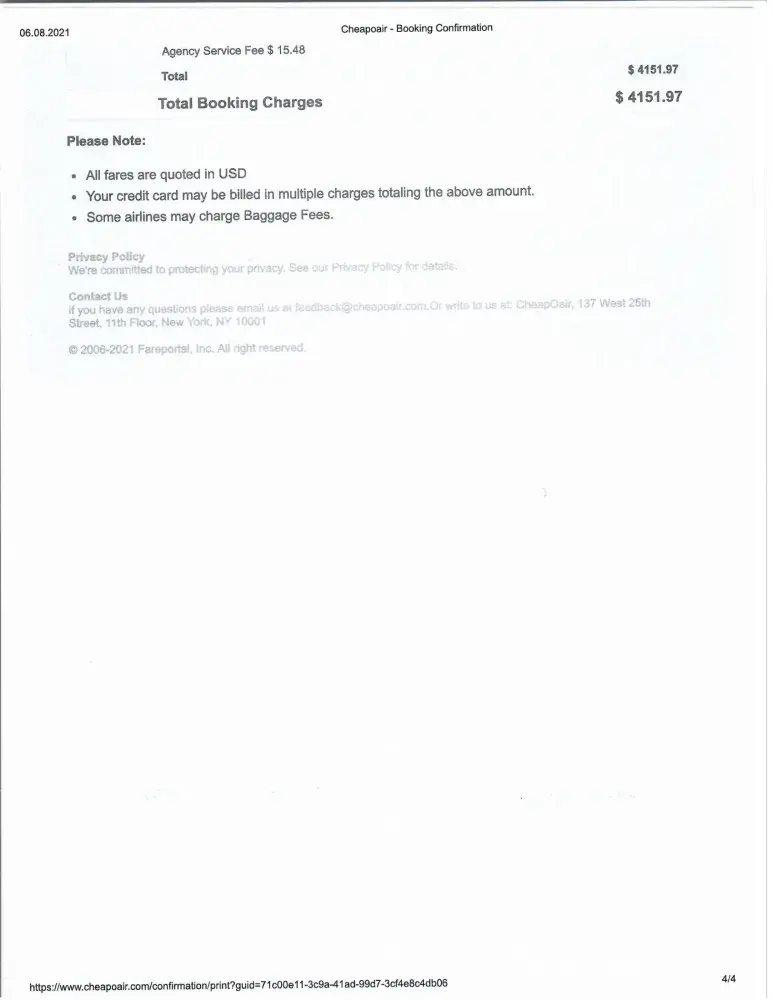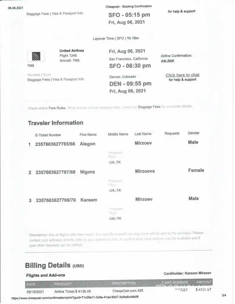 I purchased our round trip tickets from Cheapoair booking number [protected] and on 26 of June 2021 flew from Denver, Colorado U.S.A to Dushanbe, Tajikistan. According to our booking we had to fly back to USA on August 5, 2021.