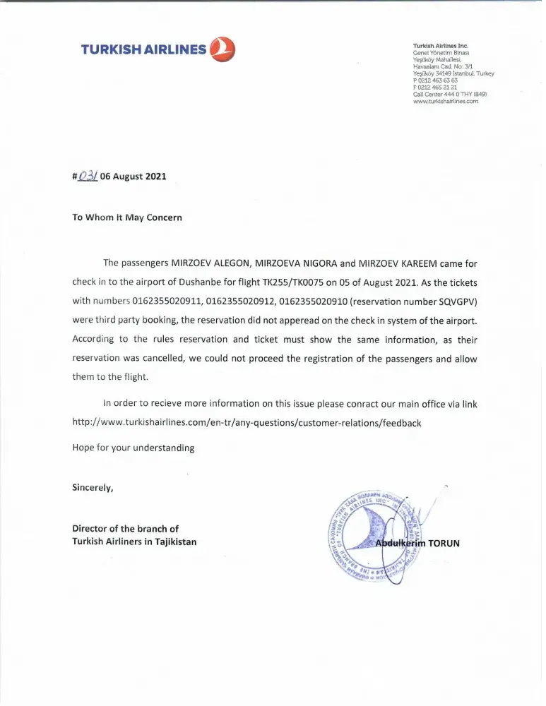On 5 august, 2021 turkish airlines in dushanbe, tajikistan didn't let us board the plane saying that our tickets are not on their systems booking #[protected] and they are claiming that there is no itinerary. We got stuck in here in dushanbe, tajikistan and cannot fly back.